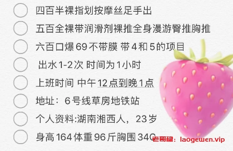 前就有LY给发私信让我分享下信息,但之前有联系的大店至今没有开课,会员费八成还是打水漂了,就没给LY们发联系方式:[sell=50,2],最近刚探好路的一个LF,安全很多,可以分享出来了。疫情这么久真的在家要憋坏了,qq上假的一个妹子没主动去联系过,看她发状态自行隔离14天后就开始上课了。发了照片感觉是我的口味。又观望了几天她更新的状态,目测还是比较安全的,安耐不住主动联系了下。给发来菜单,看了价格开始第一次前往。淡定进小区,测温,看证,全程很顺利。本人和照片还是比较像的,身材属于偏丰满型,臀部给力,也是我最喜欢的一点。妹子挺健谈的,聊天很舒服,不尴尬。具体细节就不描述了,你们都懂。