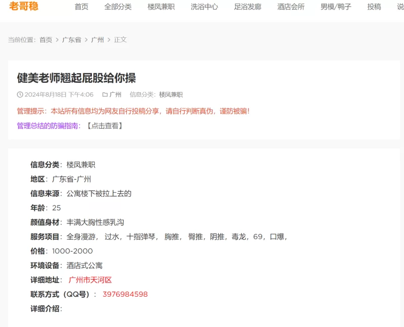 网站上找到的联系方式:[sell=50,2],比较喜欢,加了,联系之后要价800,需要自己开酒店,人到了,虽然跟网站上不一样,颜值身材还可以,就没计较。然后就要路费,想着已经开好房了,也不差这一点,就给了,本来说好的要带制服的,结果没有,我不同意,后来对方说是让人送,当面打的语音,联系人送,然后帮我洗了个澡,一会电话来了,让我等下,穿衣服下去拿,下去了人就消失了,电话QQ都拉黑了